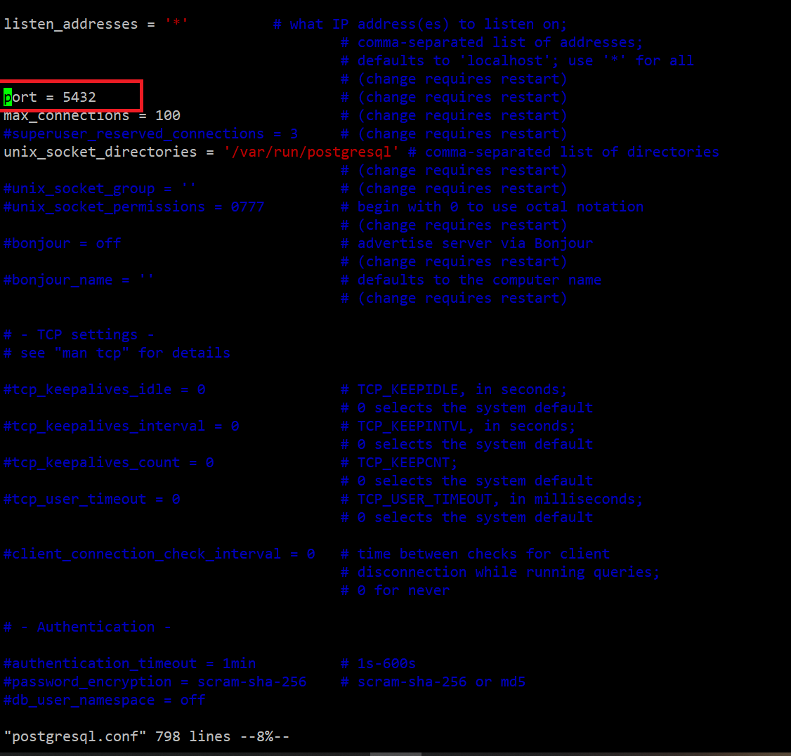 PostgreSQL을 설치하고 나면 postgresql.conf 파일을 통해서 기본 Port가 아닌 원하는 Port로 설정할 수 있다. 기본적으로 5432 Port를 사용하고 있으나, 해당 부분은 외부에 오픈되어있는 경우 쉽게 공격 대