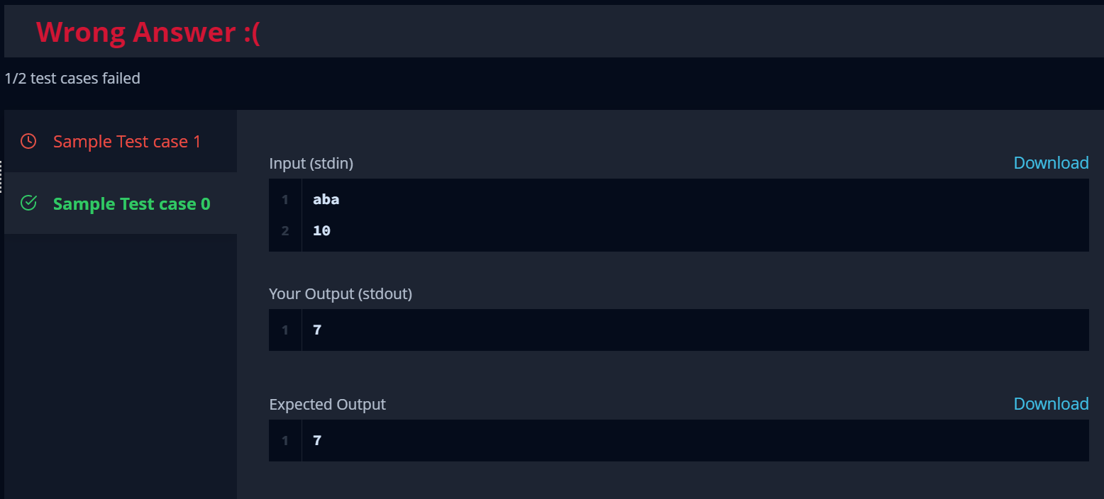 - 위에서 구한 몫과 "a"가 포함된 갯수를 곱하고, 나머지 값보다 적은 길이 내에 포함되었언 "a" 갯수를 더하여 최종 결과로 반환한다.
