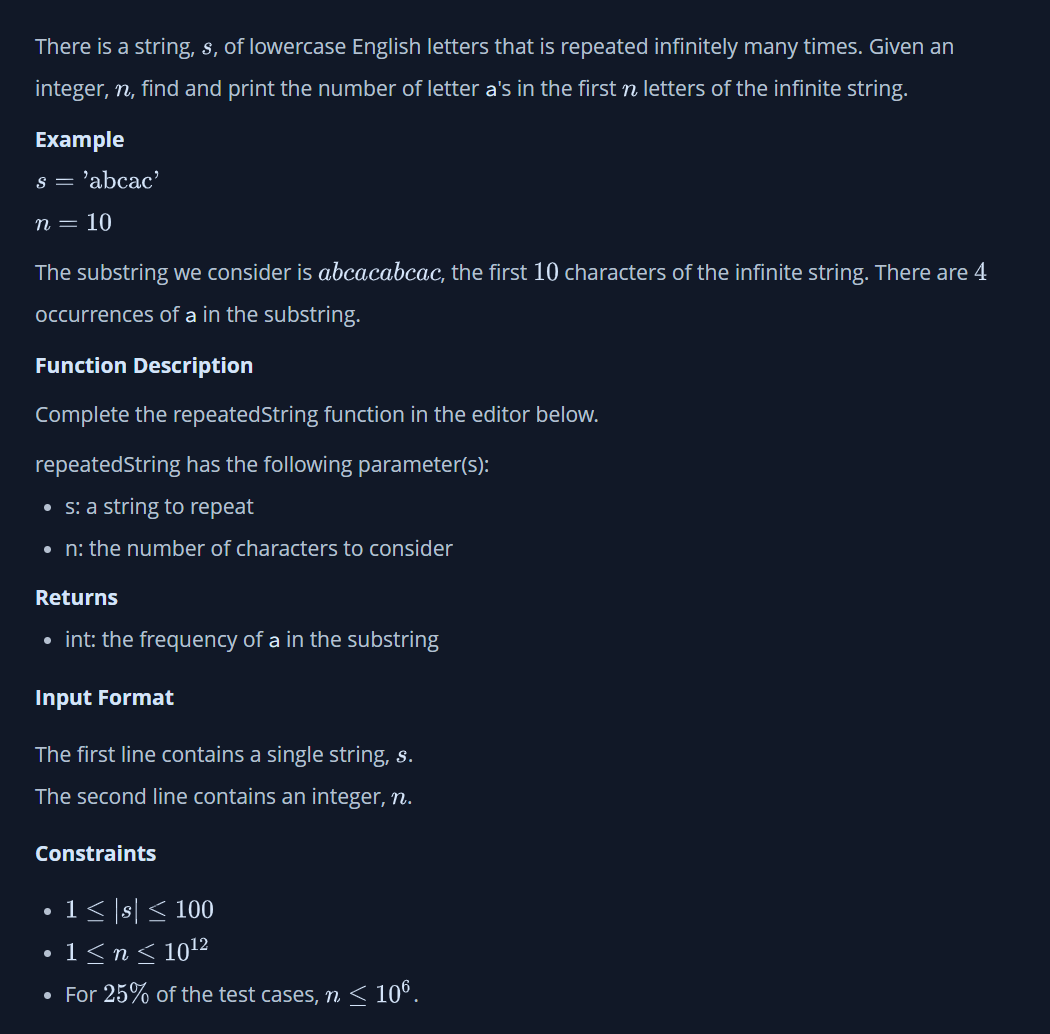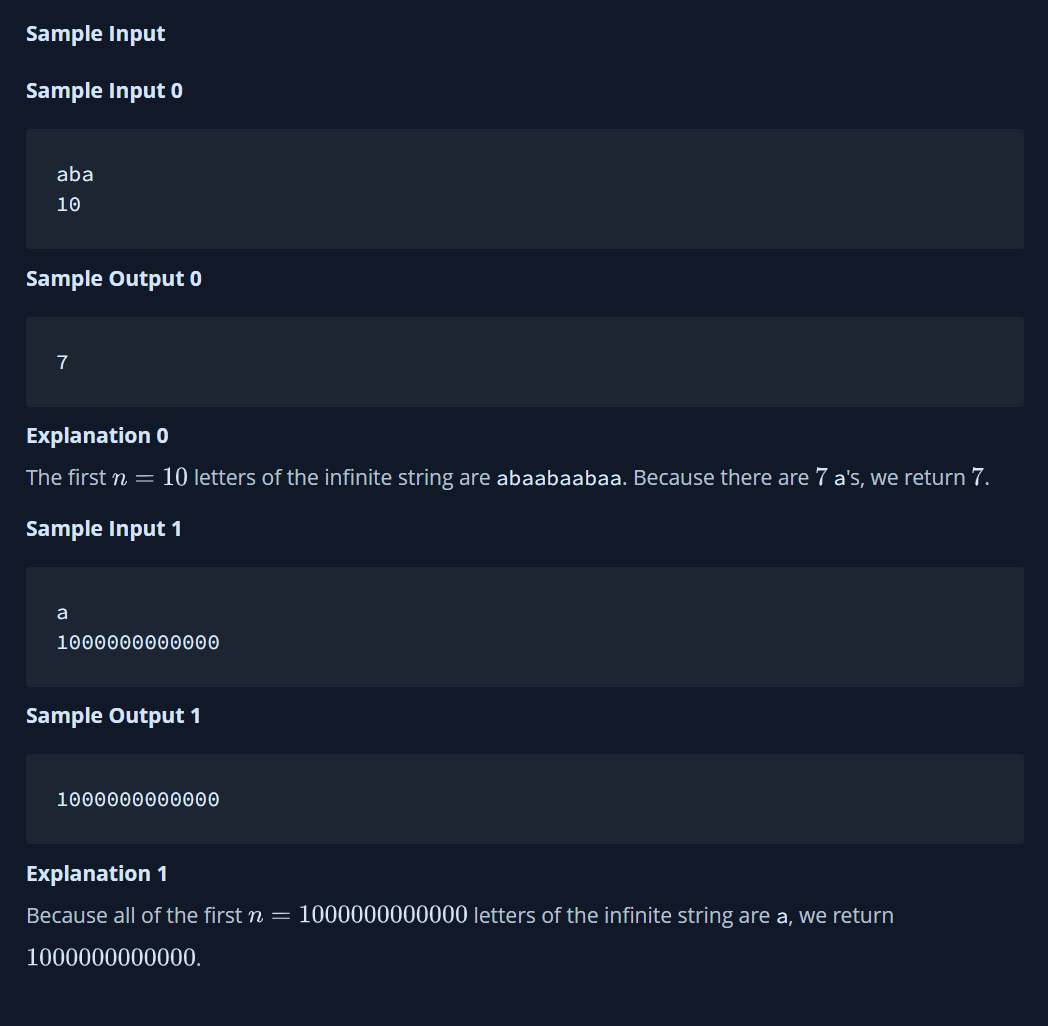- 하나의 문자열(s)이 주어지고, 길이(n)가 주어질 때, 해당 문자열을 해당 길이까지 동안 반복하였을때, "a" 개수를 찾는 문제이다.