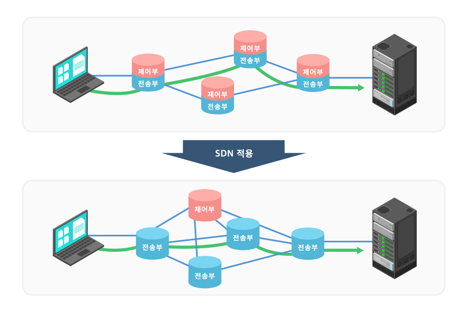 기존의 라우터(Router) 네트워크 장비에는 제어부와 전송부가 같이 존재한다. 제어부에서 최적의 경로를 계산하고 전송부가 데이터를 전송하는 방식이다.