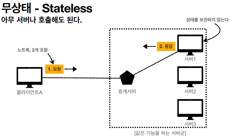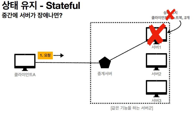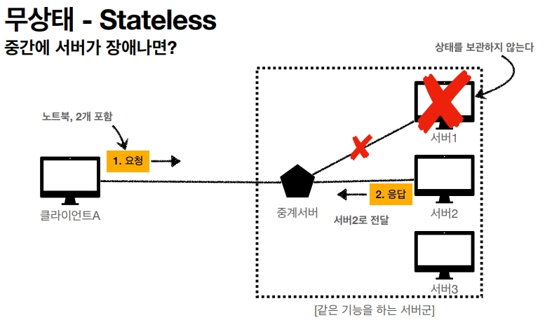그러다보니 서버1에서 문제가 발생된다고 하여도, 어차피 클라이언트A에서 필요한 상태를 모두 전달하기 때문에 다른 서버인 서버2와 통신한다고 하더라도 큰 문제 없이 통신이 가능하다.