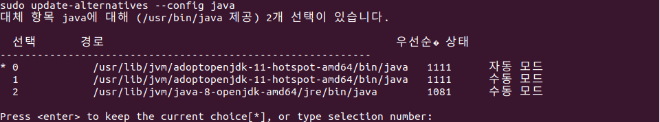 여러 버전의 Java를 설치했다면 아래의 명령으로 Java 버전을 선택할 수 있다.