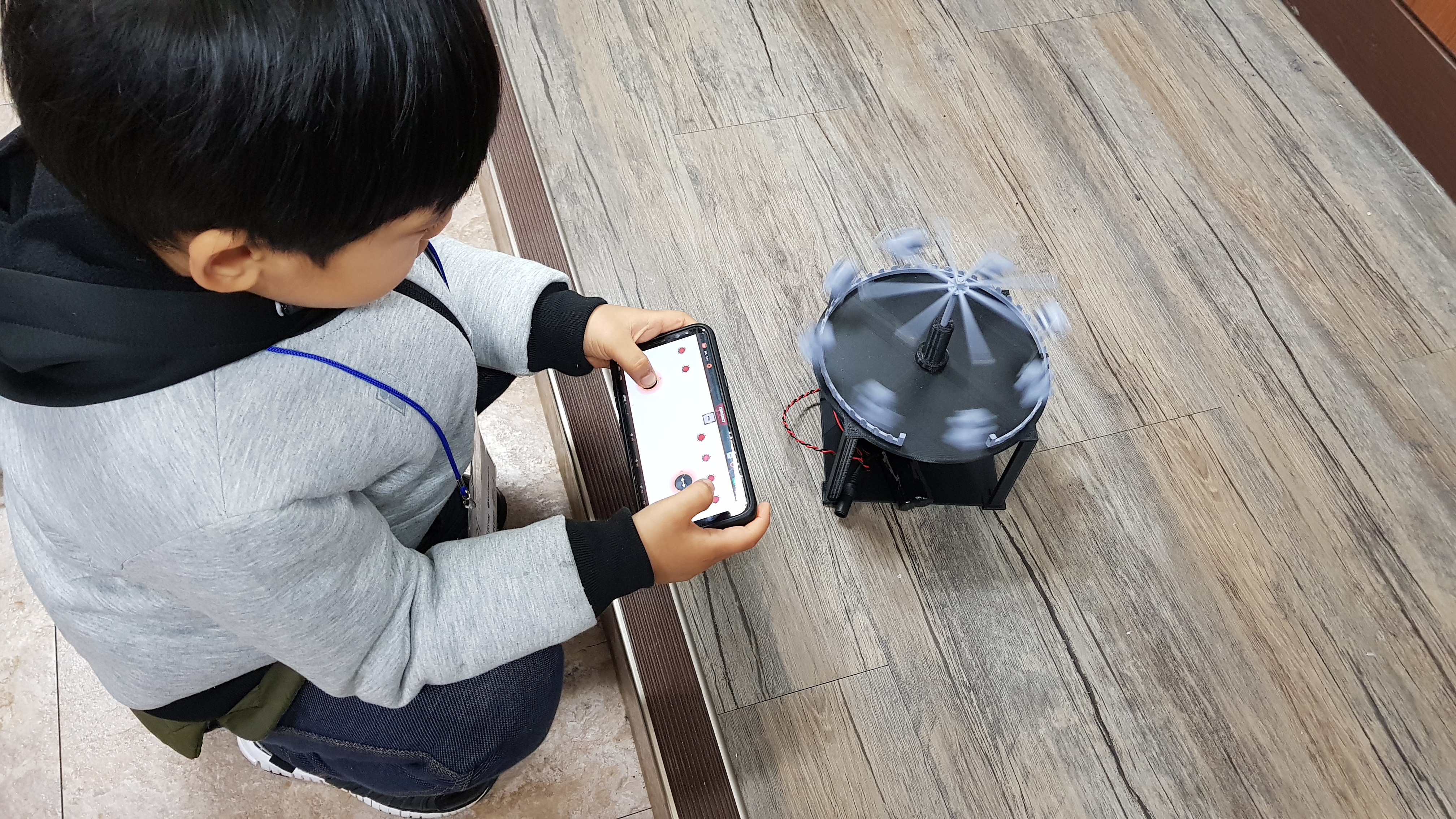 그 이름은 "움직이는 휴지통" 으로, 서보모터(방향 조절을 하는 모터)와 DC모터(원운동을 하는 모터)를 연결하여, 스마트폰 앱 조종을 통해 바퀴로 움직이고, 휴지통 뚜껑을 열어줄 수 있는 로봇이었다.