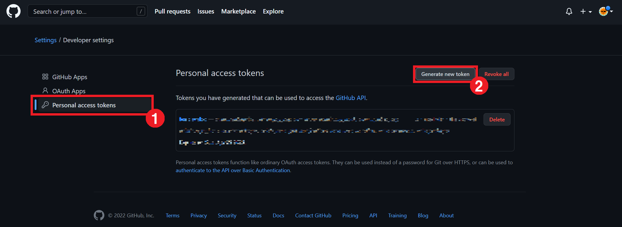 (3) 좌측 탭의 Personal access tokens탭 클릭 후, Generate new token 버튼을 클릭한다.