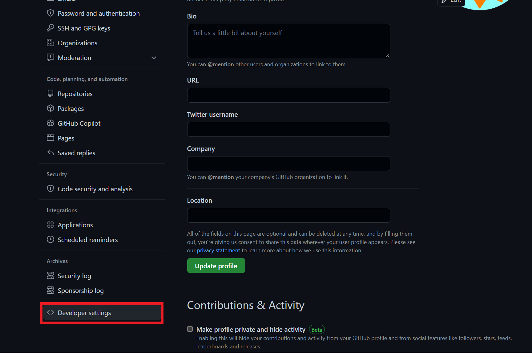 (2) Settings페이지의 좌측 탭 하단의 "Developer settings"탭 클릭