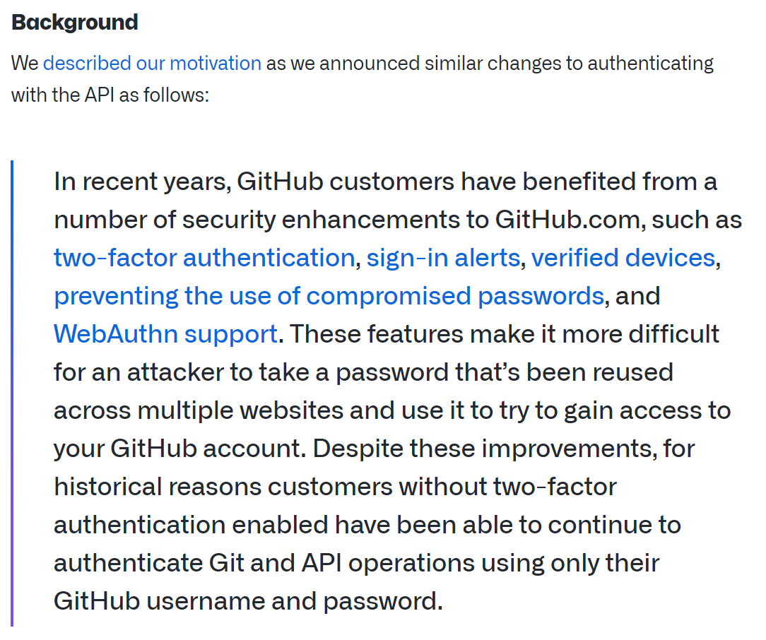 최근 GitHub은 여러 보안관련 개선사항을 내놓았는데, 이러한 개선사항에도 불구하고 역사적 사유로 2단계 인증이 활성화되지 않은 고객은 GitHub 사용자 이름과 비밀번호만 사용하여 Git 및 API 작업을 계속 인증할수 있었다.