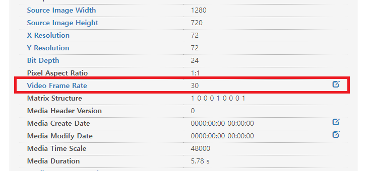 변환을 마친 후, 다시 메타데이터를 조회해 보니 Video Frame Rate가 30이라는 값으로 나타났다.