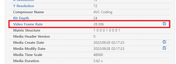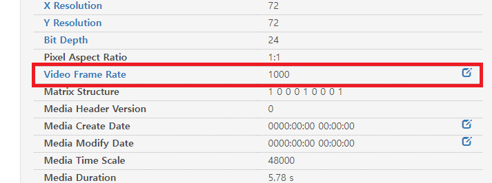 우측(정상 재생되는 mp4영상)의 Frame Rate는 28.306인 정상적인 수치가 나타나는 반면, 좌측(내가 처리한 mp4영상)의 Frame Rate는 1000이라는 이상한 값이 나타났다.