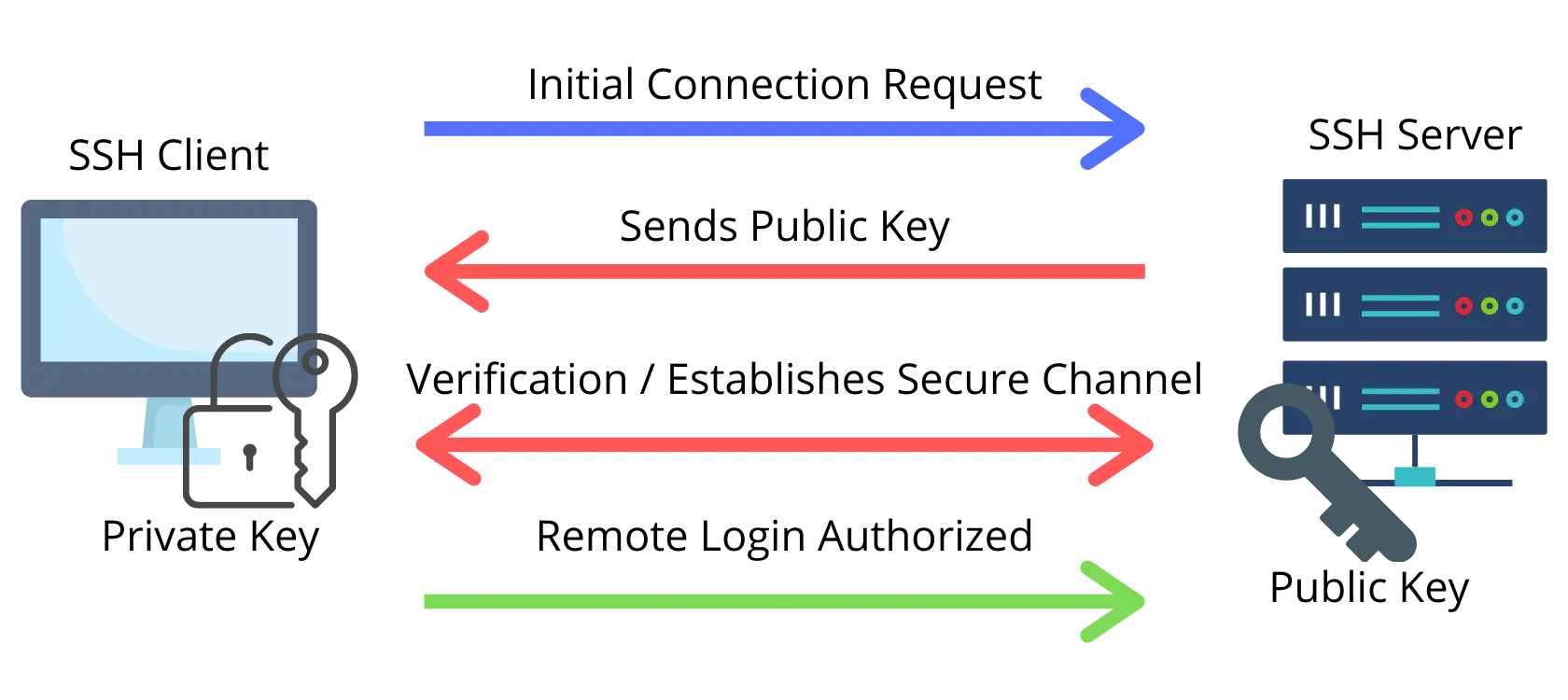 SSH 인증은 일반적으로 클라이언트와 서버 간의 연결이 연결 요청을 만드는 SSH 클라이언트에 의해 시작되는 고전적인 클라이언트-서버 모델을 통해 구현된다. 서버는 클라이언트로부터 연결 요청을 받으면 공개 키를 SSH 클라이언트로 전송하여 공개 키 암호화로 잘 알려진 프로세스를 시작한다.