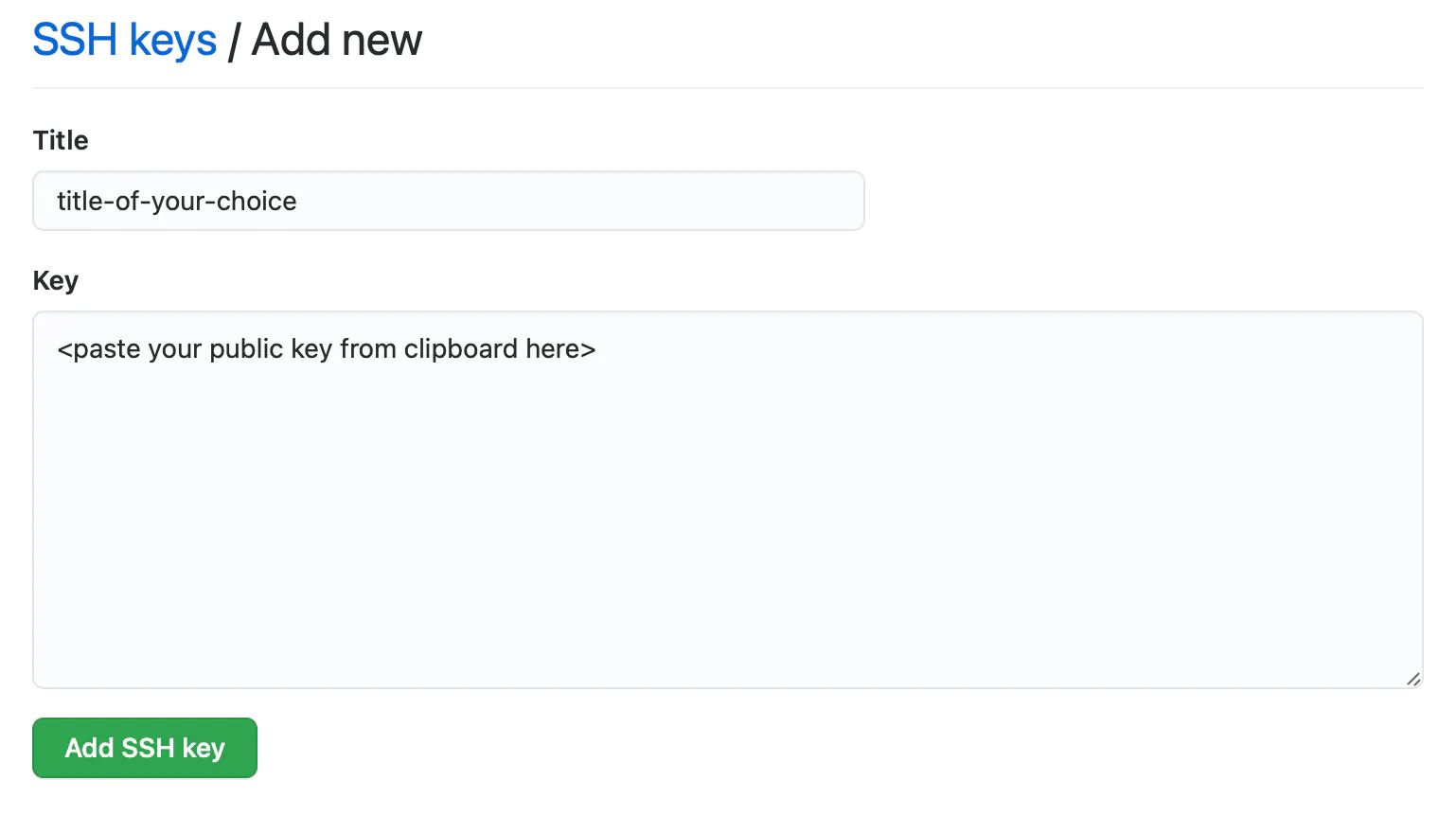 이제 Github 계정 > 설정 > SSH 및 GPG 키로 이동한다. “New SSH Key” 를 클릭한다. SSH의 제목을 입력하고(나중에 SSH 키를 더 추가할 경우를 대비하여 설명이 포함되도록 한다.) 클립보드에서 공개 키 내용을 복사한다.