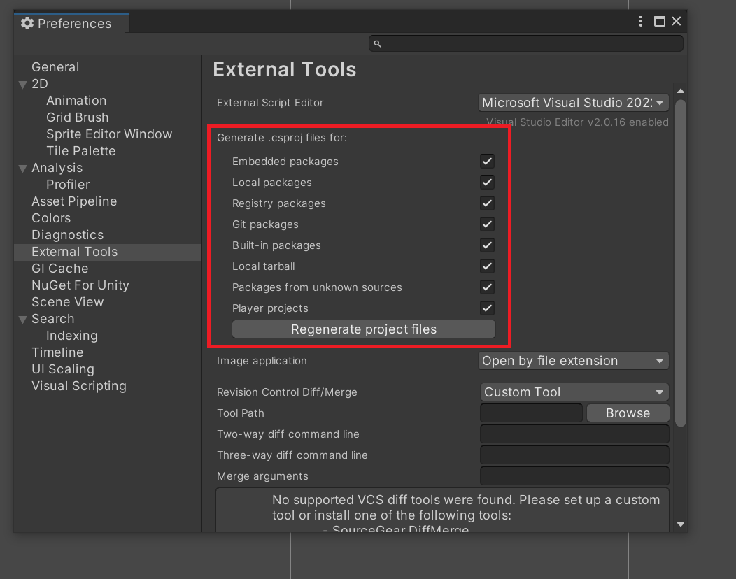 Step4: 모든 csproj 파일 생성이 선택되어 있도 Editor Attaching이 선택되어 있는지 확인한다.