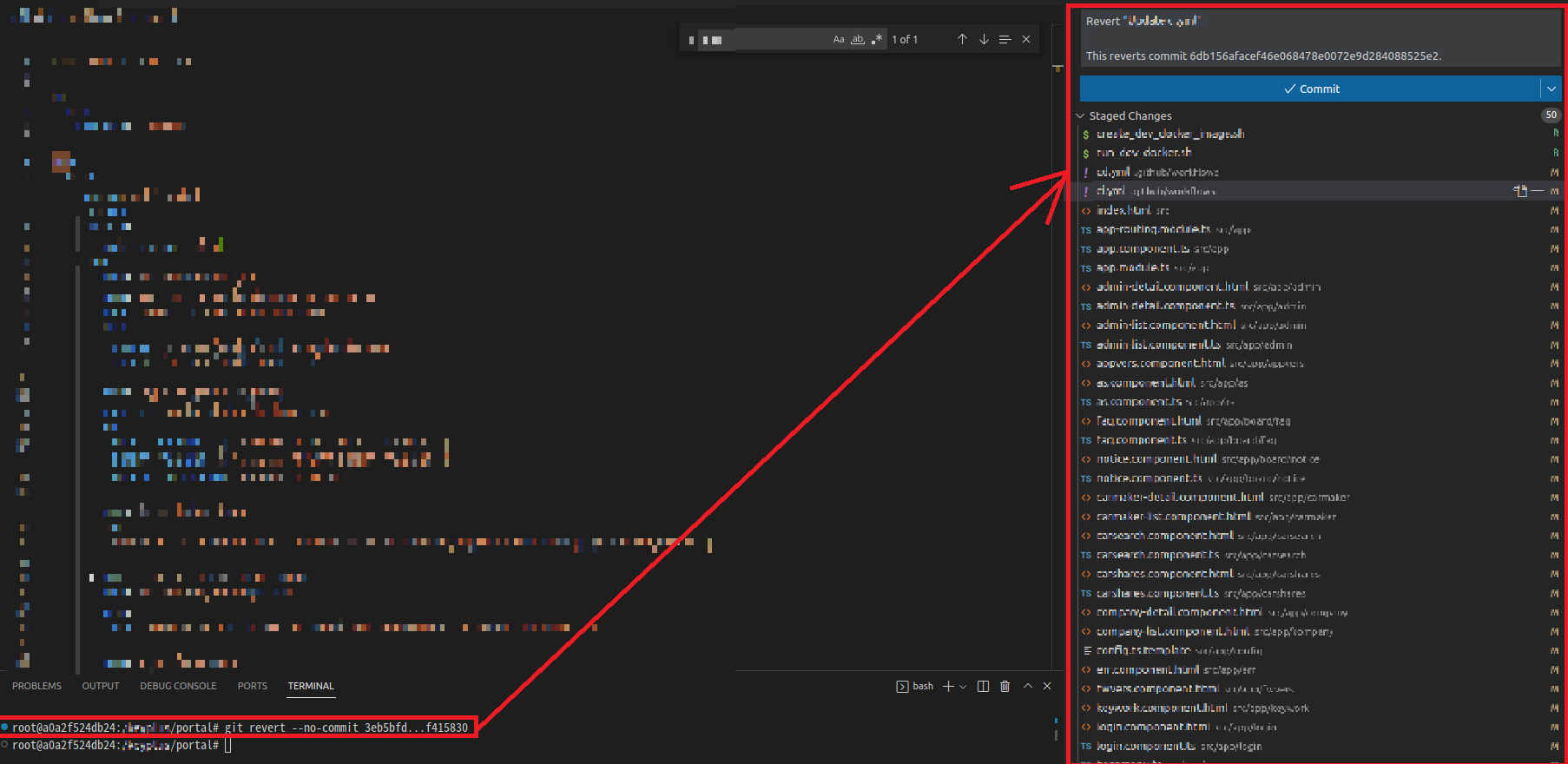 추가로 --no-commit 옵션을 주어 revert가 자동으로 커밋되지 않도록 하였다. 이렇게 함으로써 되돌아갈 지점까지 한번에 변경사항들을 모아서 한번의 revert 커밋을 남길 수 있게 된다.