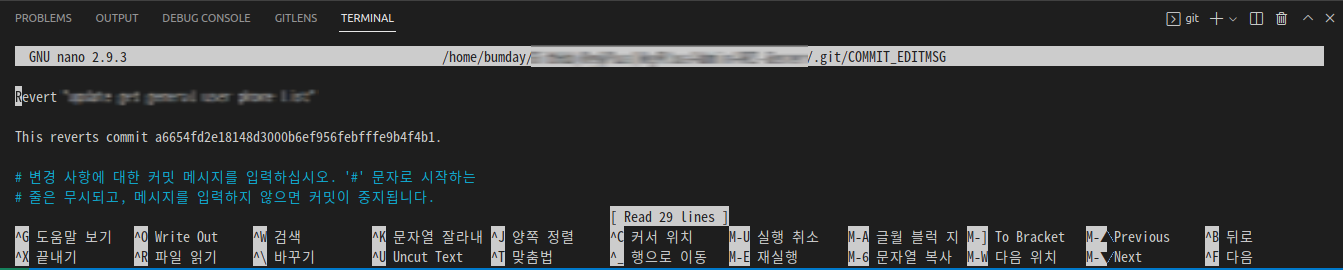 그러면 위와 같이 편집기가 열리는데, 작성한 메시지로 revert시작 후 발생한 변경 사항에 대한 커밋을 진행한다.