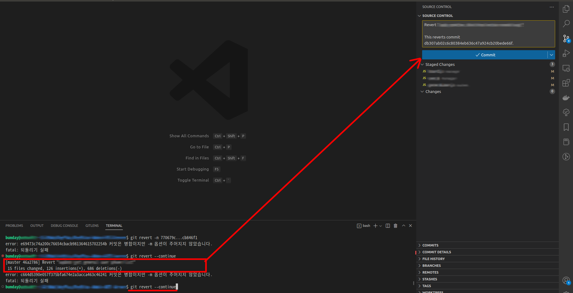 이렇게 마지막까지 revert가 완료되었고, 더이상 충돌이나 병합이 발생하지 않아 error메시지가 뜨지 않는것을 확인할 수 있다.
