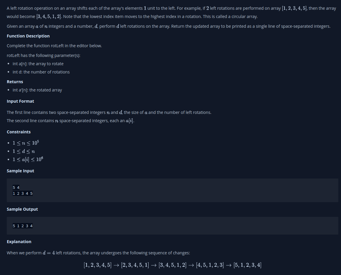 - 임의의 배열(a)과 배열의 요소들이 왼쪽으로 얼만큼 쉬프트할지 숫자(d)가 정해진다.