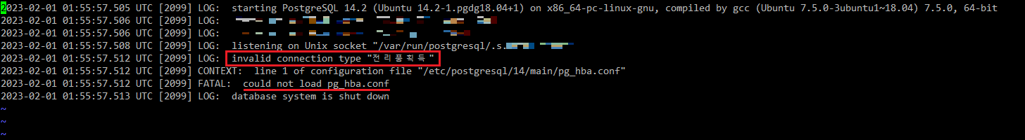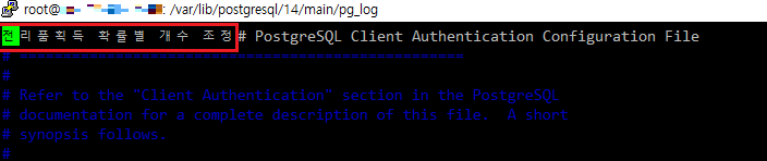 로그에서 출력된 대로 pg_hba.conf파일을 열어보았더니, 실제로 한글 문장이 불필요하게 삽입되어 있었다.
