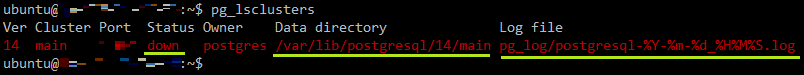그래서 pg_lsclusters 명령어를 통해 PostgreSQL 클러스터에대한 정보를 확인한 뒤,