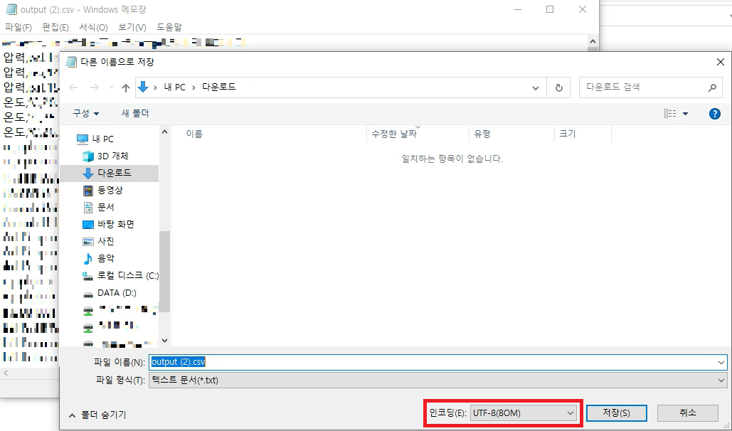문제의 csv파일을 notepad로 열어서 “다른 이름으로 저장” 을 해보면, 하단에 인코딩 방식을 볼 수 있는데, “UTF-8”로 지정되어있음을 확인할 수 있다. 따라서, 이 인코딩 방식을 수정해주어야 함을 느끼고 인코딩 방식을 “ANSI”로 지정하여 저장하고 싶었다.