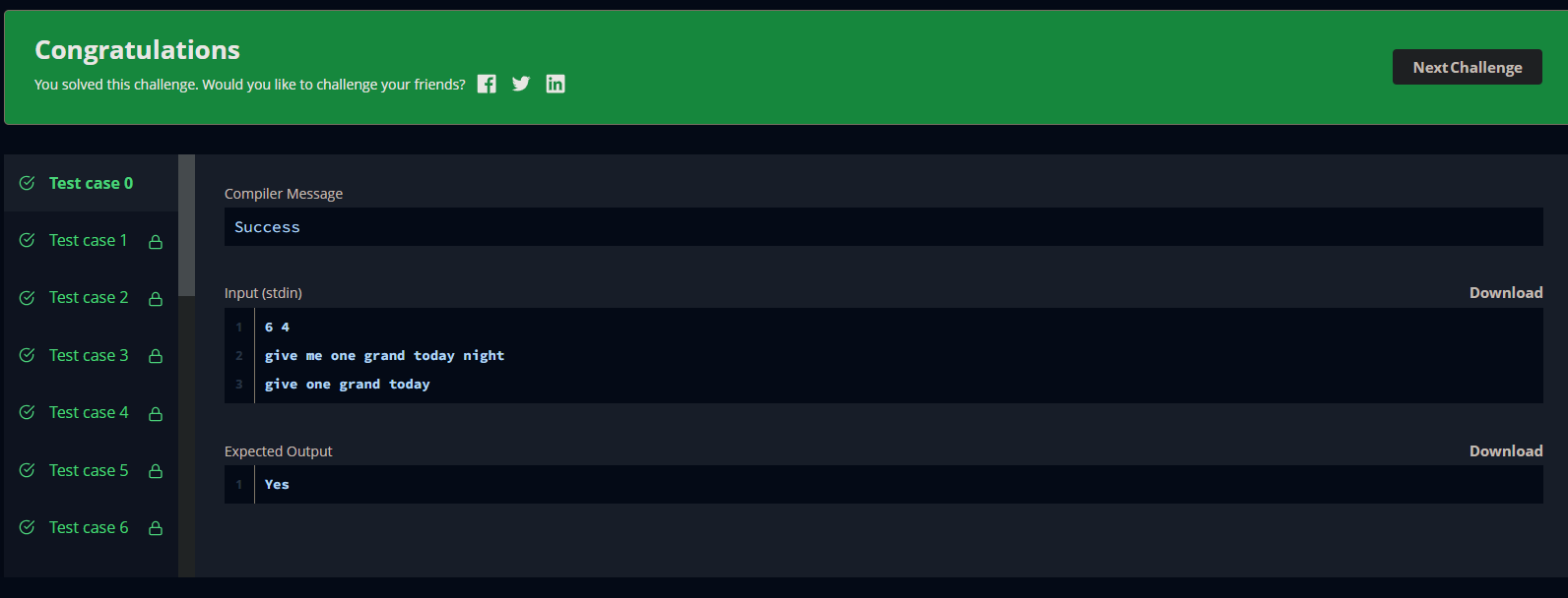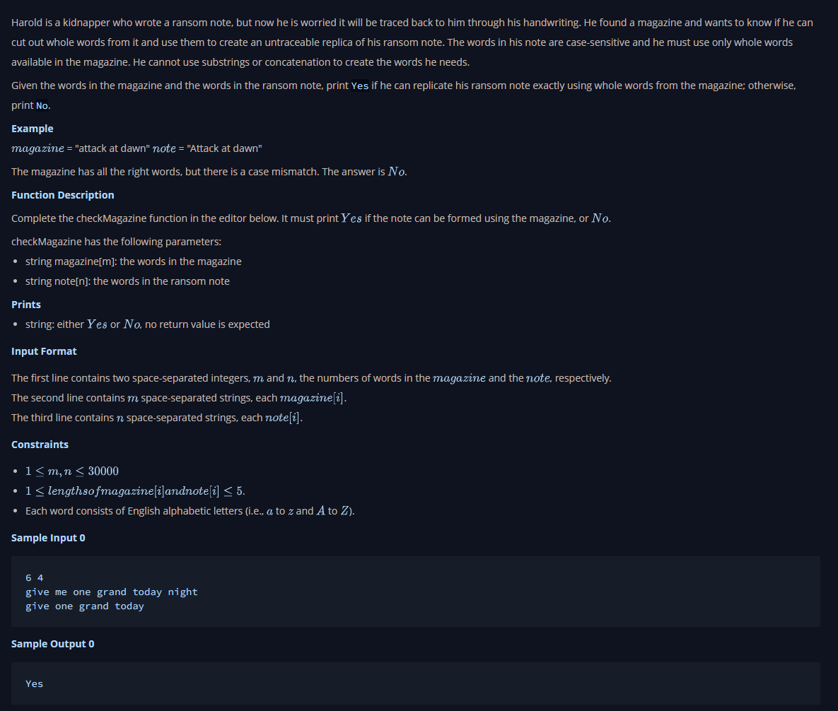 - 주어진 두 A, B string 배열을 비교하여, A배열에서 단어를 완벽히 사용하여 B 배열의 문장을 완성할 수 있는지 확인하여, 그 여부를 출력하는 간단한 문제이다.