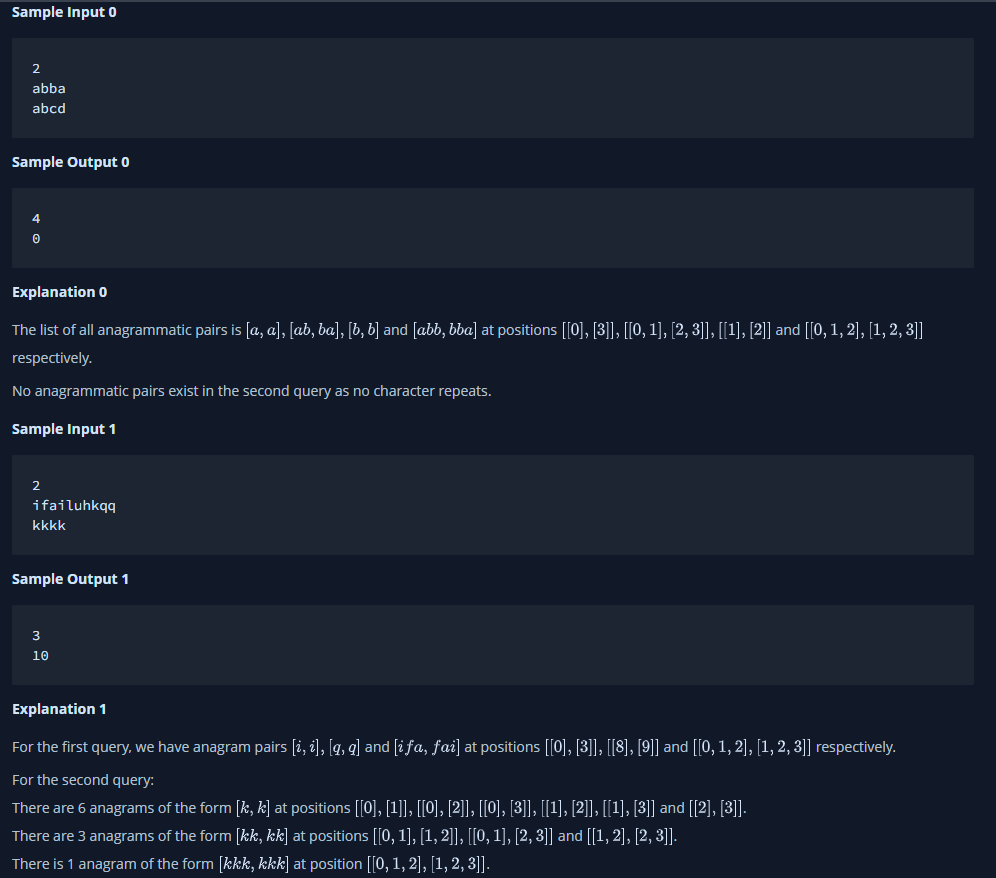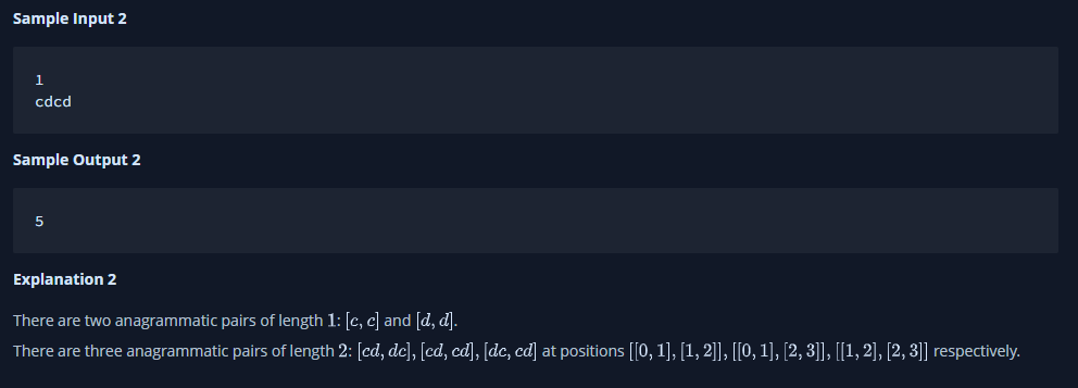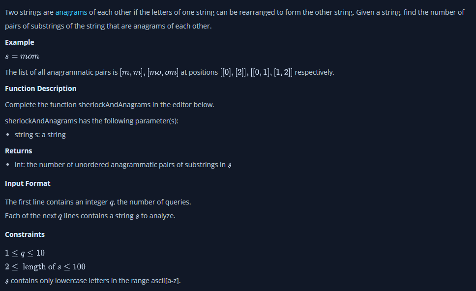 한 문자열의 문자를 재배열하여 다른 문자열을 형성할 수 있는 경우 두 문자열은 서로의 애너그램 이라고 한다. 문자열이 주어졌을때, 서로의 애너그램인 문자열의 하위 문자열 쌍의 수를 찾아야 한다.