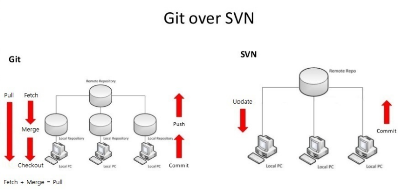 SVN은 중앙 집중식 시스템이고, Git은 분산 버전 관리 시스템이다. 이는 각 도구의 작동 방식과 사용 사례에 큰 영향을 미친다.
