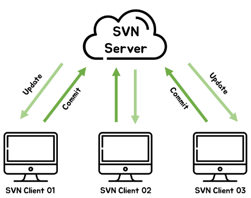 SVN은 클라이언트-서버 모델을 따른다. 중앙 저장소(Repository)에 모든 코드와 변경 이력이 저장되며, 클라이언트는 이 저장소와 통신하여 작업을 수행한다.
