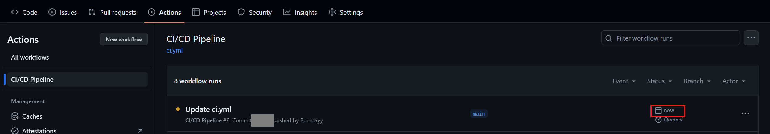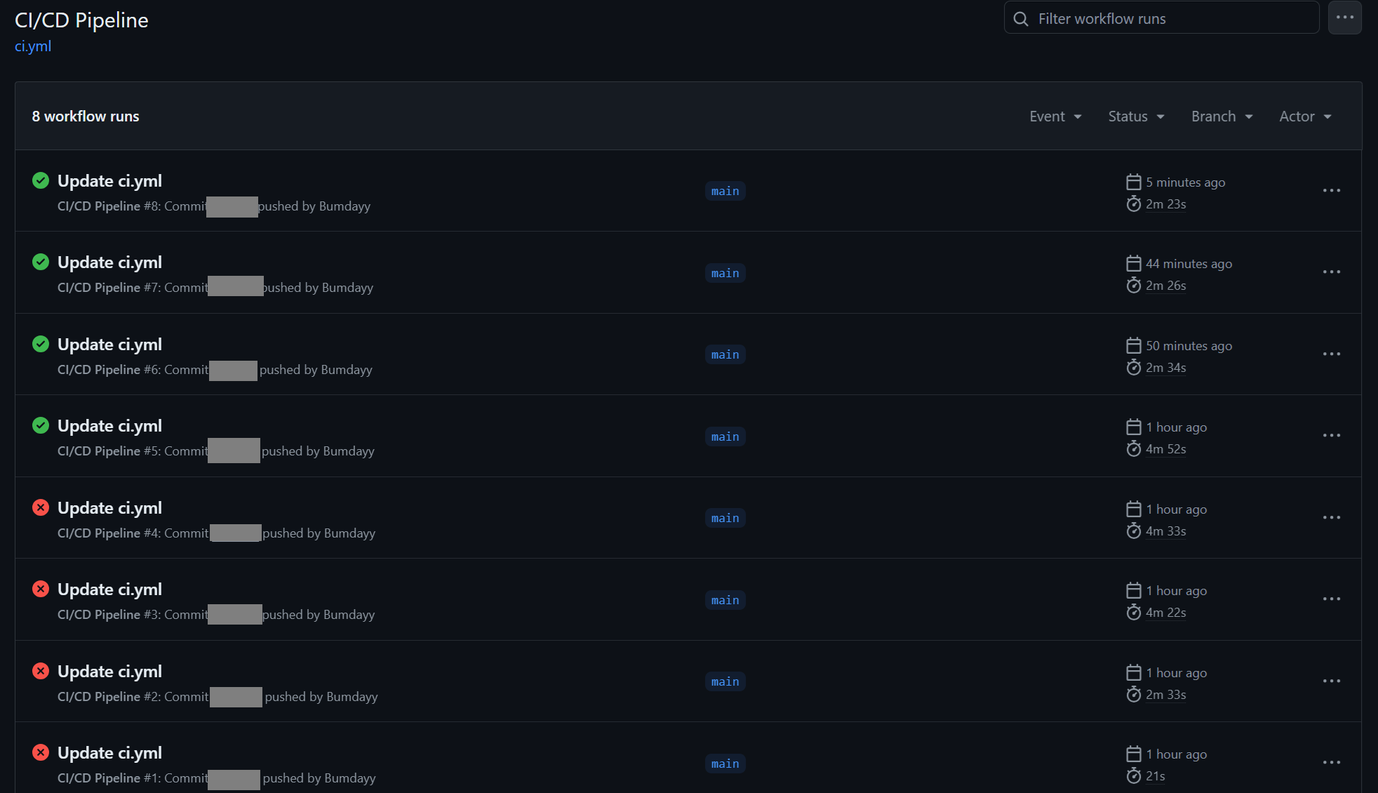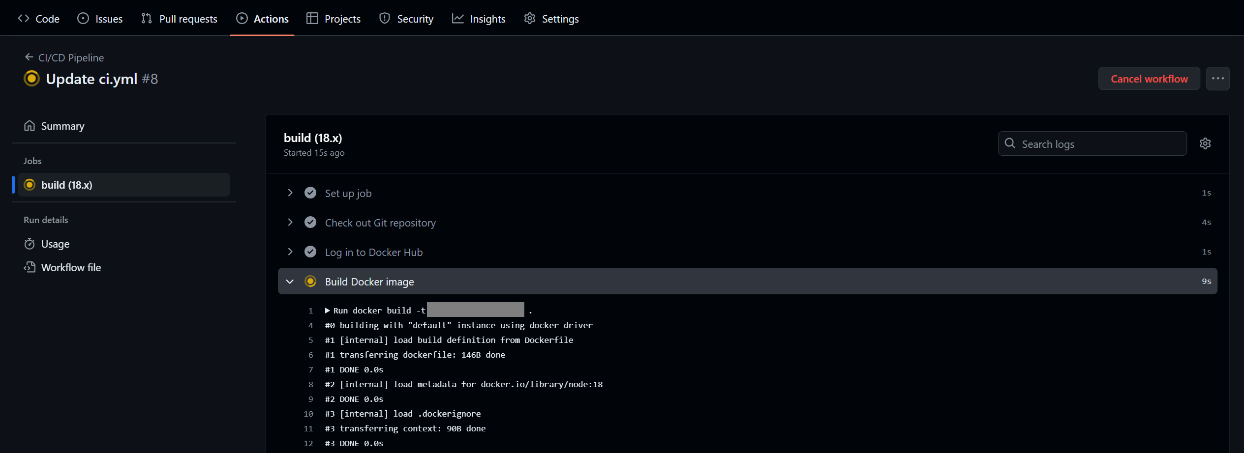 workflow yml 파일에 작성한 바와 같이, 순차적으로 작업이 실행되며 출력되는 텍스트들을 실시간으로 확인할 수 있다.