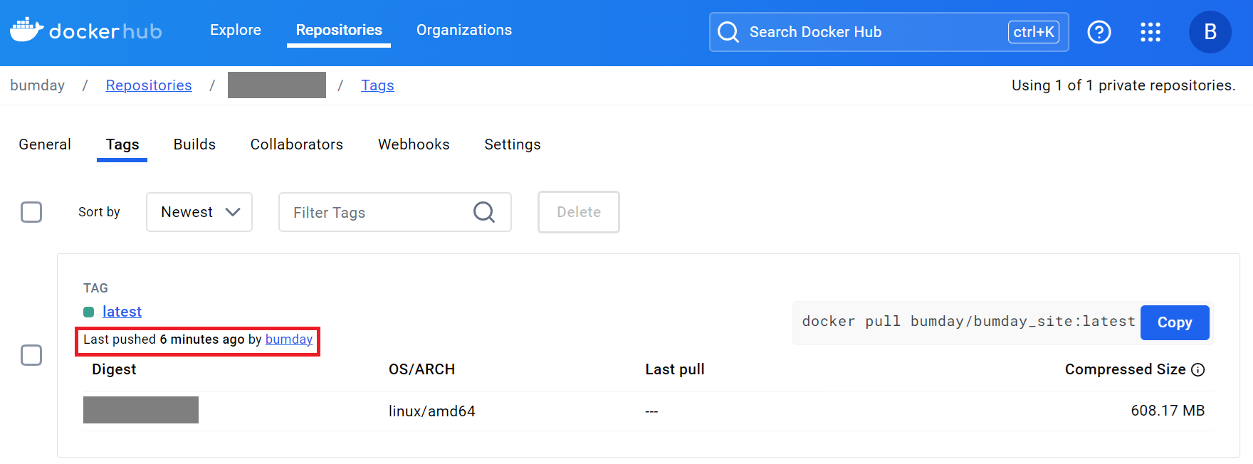 Docker Hub 레포지토리에서도 확인해보면, 이미지가 방금 push되었음을 확인할 수 있다.