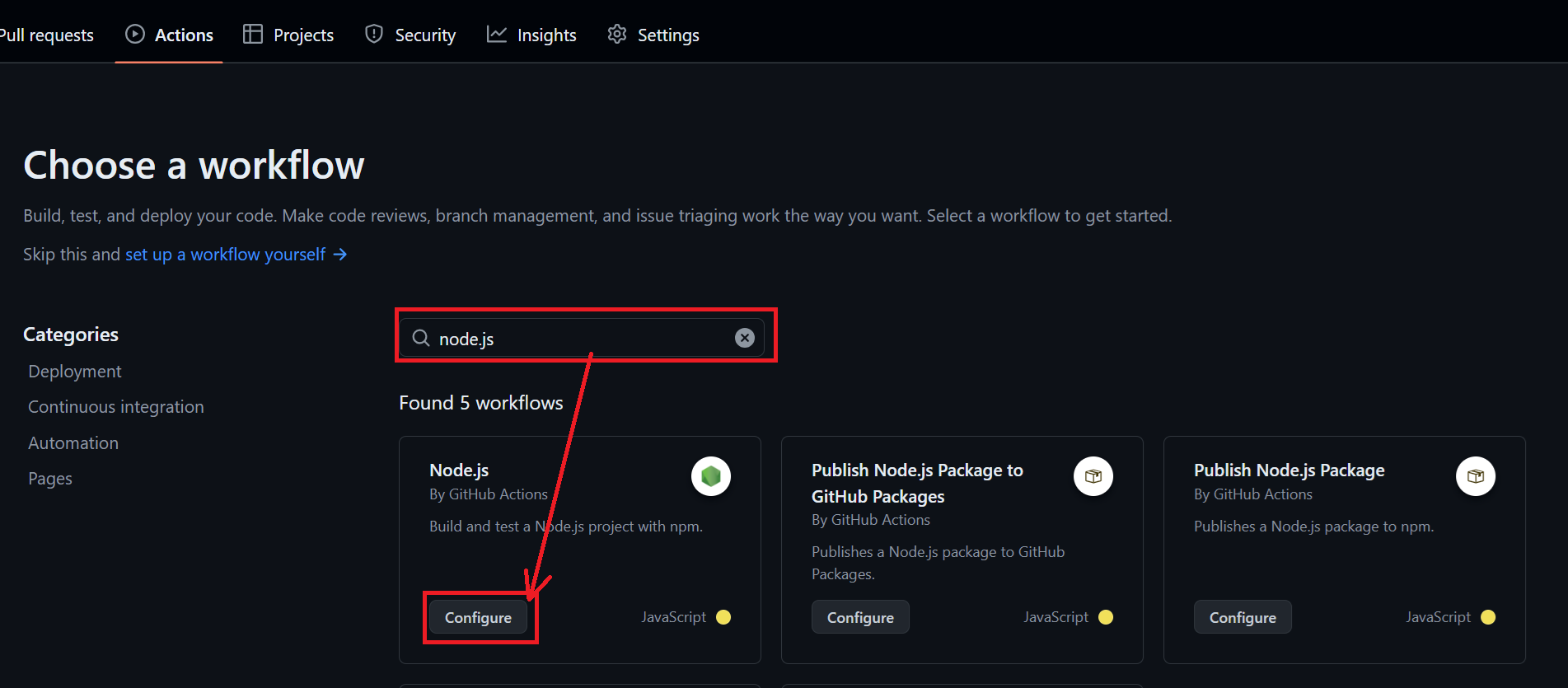 그런 다음, Choose a workflow에서 "node.js" 를 검색 후, "Configure" 버튼을 누른다.