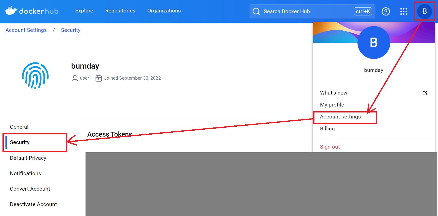 Docker Hub에서 Account Settings를 클릭한 후, 좌측의 "Security" 탭을 누른다.