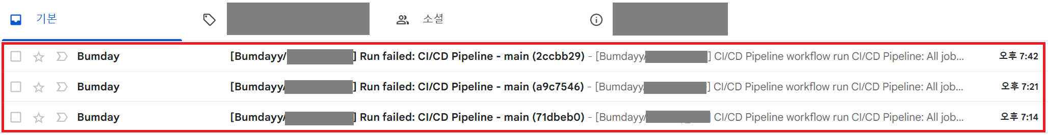 만일 작업이 실패하면, 빨간 X표시와 함께 작업이 실패했다고 메일로 알람이 온다.