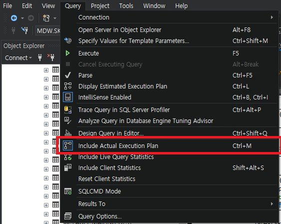 실행 계획 보기 옵션은 Query → Include Actual Execution Plan 을 클릭하여 활성화 할 수 있다.