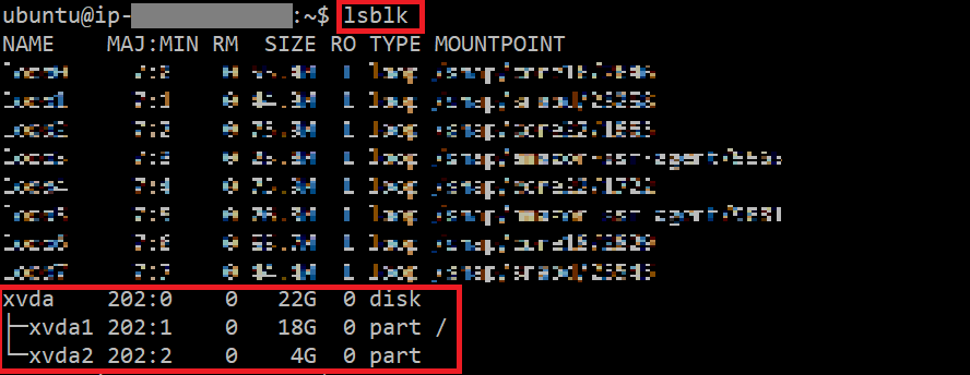 여기서 xvda 볼륨이 22GB로 증가했지만, 기존 루트 파티션 xvda1은 여전히 18GB로 남아있고, 새로운 4GB가 xvda2로 별도 파티션이 생성되었다. 우리는 이 4GB를 xvda1과 합쳐야 한다.