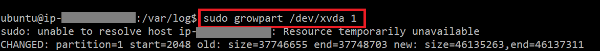 이는 기존 파티션의 용량이 꽉 차서 growpart가 실행되지 않는 문제이다. 해결 방법은 다음과 같다.