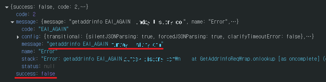 EAI_AGAIN 은 Node.js 내부의 getaddrinfo 호출에서 발생하는 에러로, 보통 DNS* 조회 실패를 의미한다.