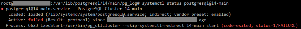 systemctl status postgresql@14-main 을 통해 확인한 결과, 다음과 같은 에러 로그가 출력되었다.