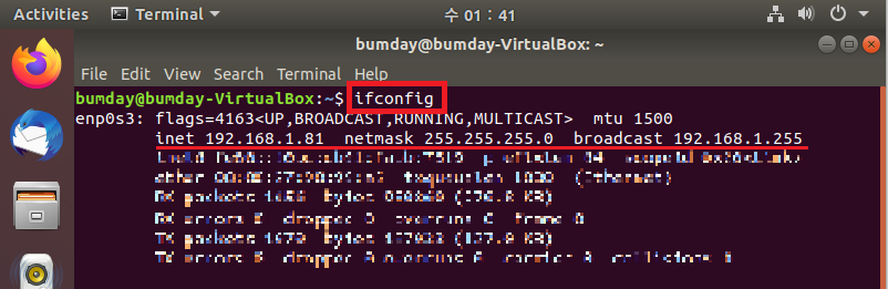 이후 터미널에서 ifconfig 명령어로 적용 확인