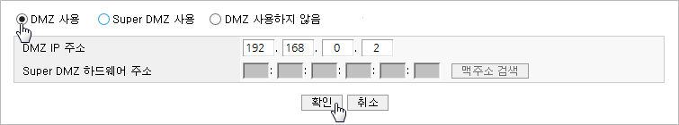 그 후 아래의 예와 같은 DMZ설정을 찾아 DMZ설정에 활성 또는 사용에 체크하고, DMZ IP에는 서버 프로그램이 설치된 컴퓨터의 IP (예, 192.168.0.2)를 입력하면 된다. 본 설정은 외부에서의 모든 포트 요청을 내부IP (예, 192.168.0.2 ) 로 연결하라는 의미의 설정이다.