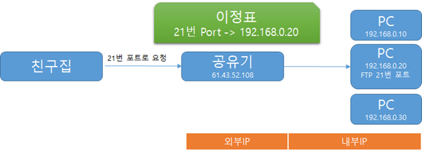 공유기를 기점으로 공유기 뒤에 있는 PC들은 내부 IP라고 부르고, 공유기를 외부 IP라고 부르게 된다. 그런데 만약 다른 영역에 있는 PC에서 내부 IP에 있는 192.168.0.20 PC에 접속하고자 하는 요청이 들어왔을 때 공유기는 어느 PC로 연결을 해주어야 할지 모르는 상태가 된다.