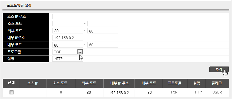 공유기에 웹 서버 / 서비스용 설정을 등록할 경우의 예시이다. 아래의 그림과 같이, 소스IP 주소와 포트는 입력할 필요가 없으며, 외부 포트에는 웹 서버/서비스의 기본 포트인 80 ~ 80, 내부 IP주소는 웹 서버 / 서비스가 설치된 컴퓨터의 IPv4주소인 192.168.0.2, 내부 포트는 80 ~ 80, 프로토콜은 TCP, 설명에는 임의로 "HTTP"를 입력하고 추가,저장하면 설정이 모두 완료된다.