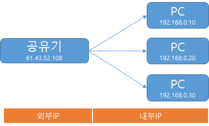 공유기를 설치하게 되면 위와 같이 공유기와 연결된 PC들은 192.168~로 시작하는 IP를 공유기로부터 부여받게 된다. 그리고 공유기는 ISP 업체로부터 할당받은 IP를 가지게 된다.