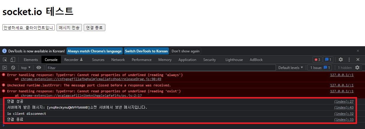 - 결과적으로 위 코드는 socket.io모듈이 자동으로 생성해둔 http://127.0.0.1:30001/socket.io/socket.io.js 에 접근하여 JS 스크립트를 불러오게 된다.