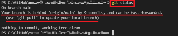 현재 나의 브랜치가 'origin/main'의 9 커밋 뒤에 있다며, 빨리감기 할 수 있다고 한다.