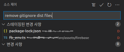아래는 이를 수행하였을때, .gitignore에 적용하였으나 계속 push되던 파일들이 "Delete" 변경사항으로 남은것을 볼 수 있다. 이를 스테이징 한 후 푸시해주면 해결이 된다.