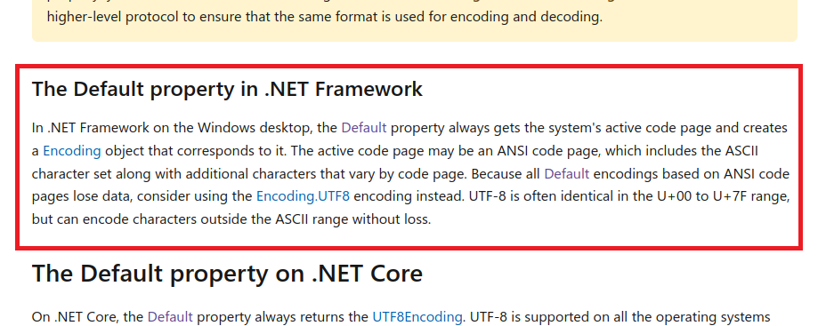 .NET사이트를 탐색해보니 위의 사진과 같이 Windows desktop의 .NET Framework의 기본 속성은 시스템의 활성 코드 페이지를 가져오고, 이에 해당하는 Encoding 개체를 만든다고 한다.