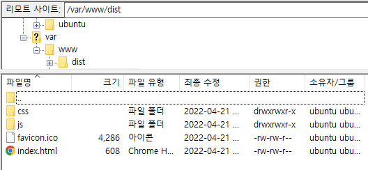 이제 AWS EC2서버에 접속하여, 아래의 경로에 해당 dist/ 폴더 전체를 옮긴다.
