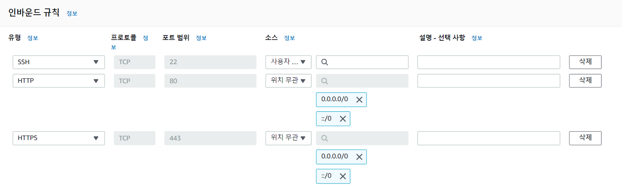 (HTTPS도 사용할 예정이라면, "HTTPS" 유형의 항목도 추가해 준다.)