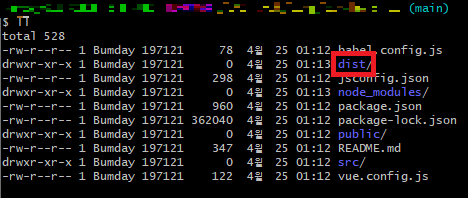 빌드가 끝나면, 아래와 같이 dist폴더가 생성됨을 확인할 수 있다.