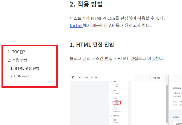 아래는 적용 결과이다. 티스토리 글 작성시 "제목1", "제목2" 서식과 같이 마크다운을 적용한 제목들을 간추려서 사이드에 목차로 보여지고, 이를 클릭하면 글에서 해당 제목 부분으로 이동한다.