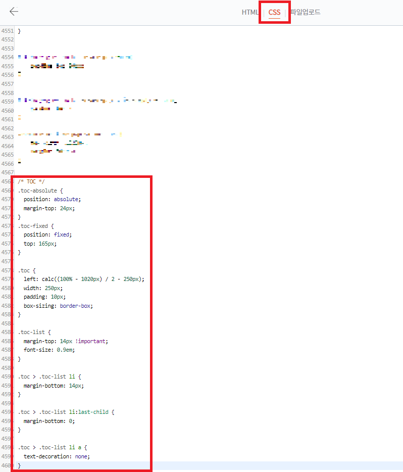 TOC 내부 목차, 위치 등을 조절하는 CSS이다.